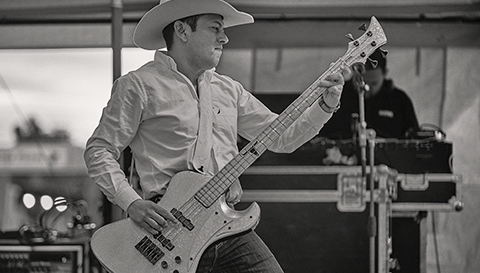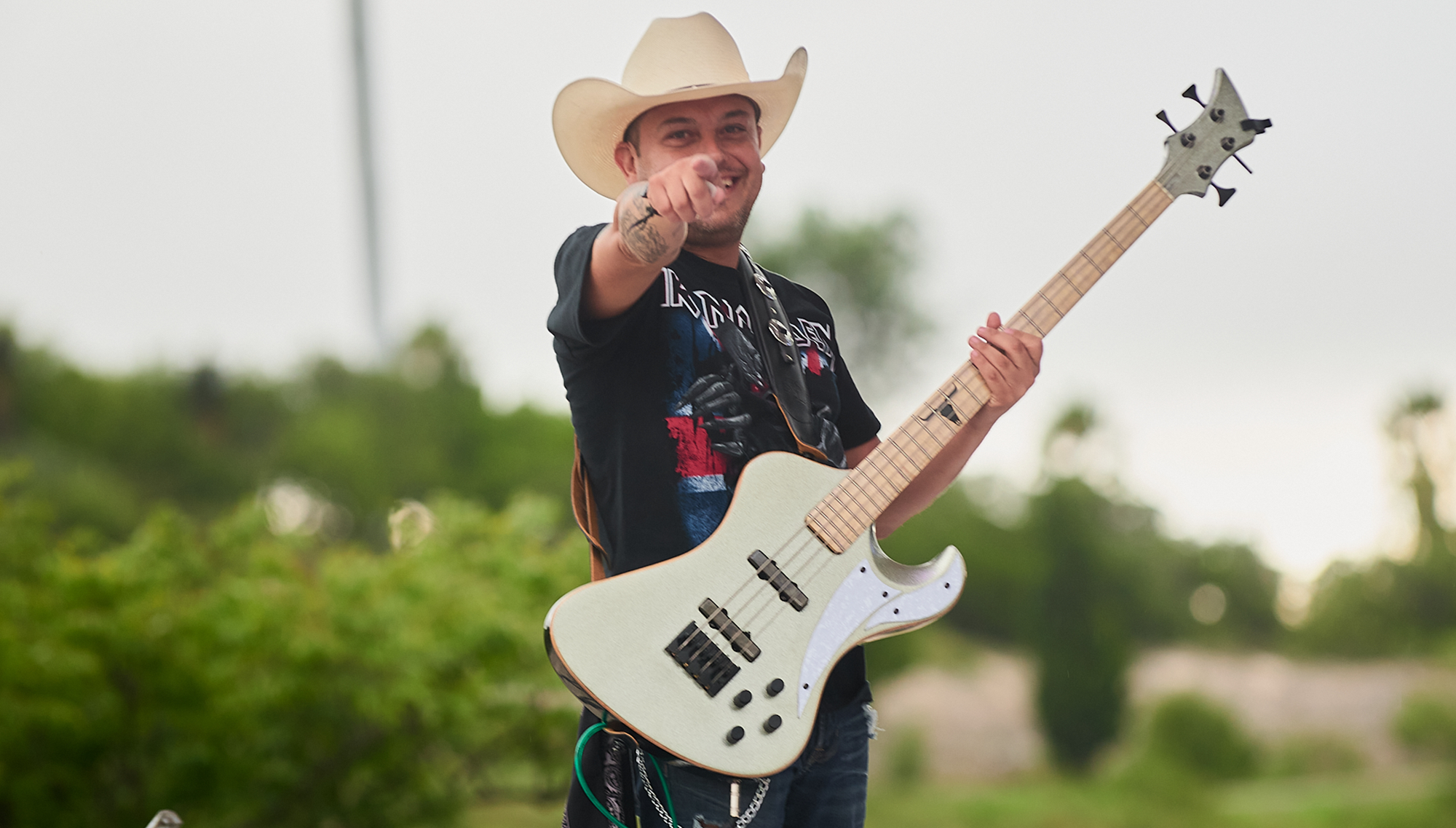 Con energía imparable y ritmo que enciende cada canción, él es el corazón de Bysonte. Nuestro baterista: pura fuerza, pasión y alma country.